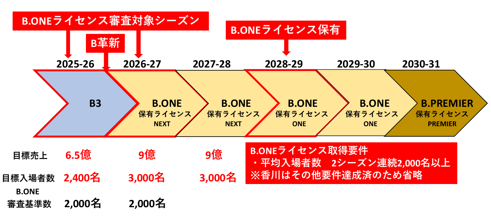 この度、香川ファイブアローズは2026-27シーズンにおけるB.NEXTライセンスの取得およびB.ONE仮入会審査をクリアし、2026-27シーズンのB.ONE参入が決定いたしました。次なるB.PREMIER参入に向けては、下図の通り、2026-27シーズンおよび2027-28シーズンをB.PREMIER審査対象期間として設定し、2028年10月開催予定であるライセンス判定理事会にて判定される「2030-31シーズンにおけるB.PREMIER参入」を目標として掲げることを宣言いたします。