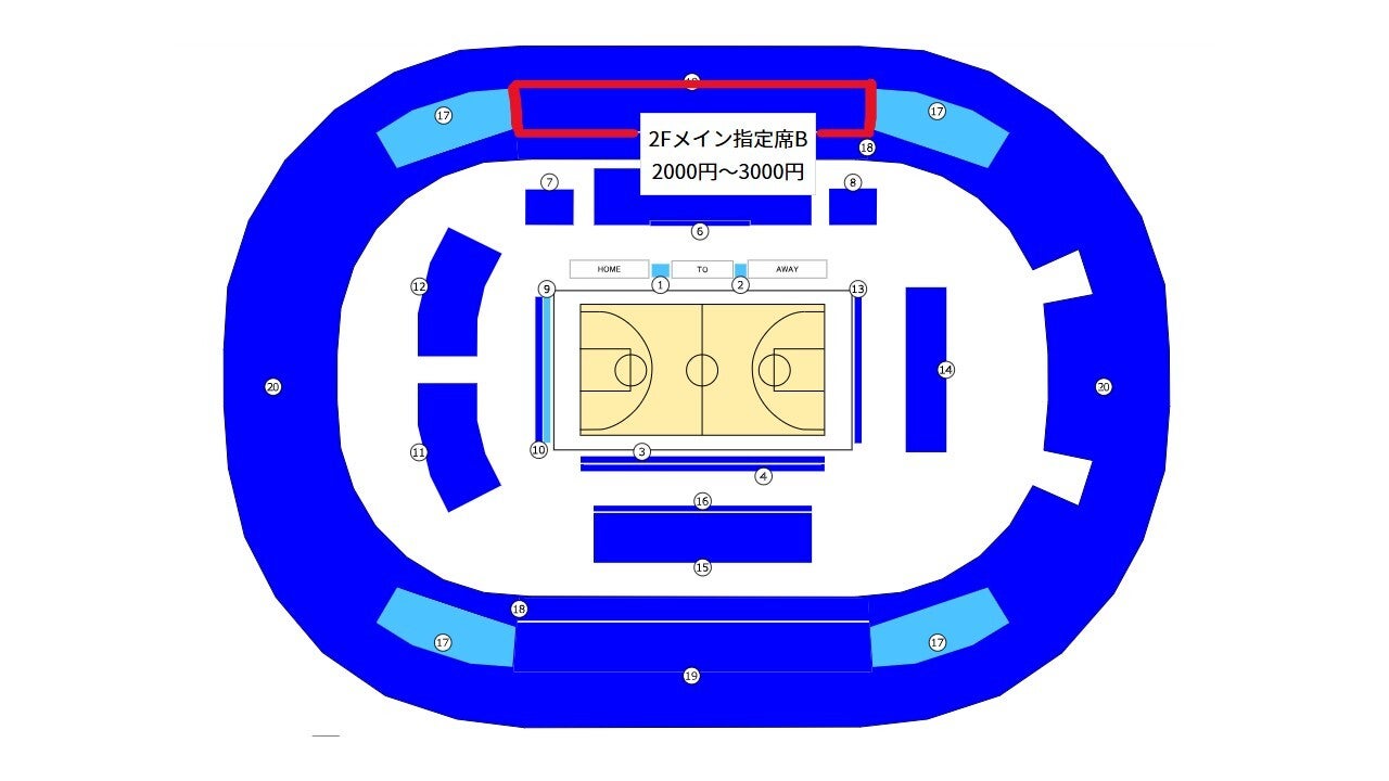 2F指定席をご購入の際は、1F席の「ベンチ」、「メイン」の表記を参考にサイドをご確認いただくか、座席図を拡大して席種をご確認いただくようお願い申し上げます。
