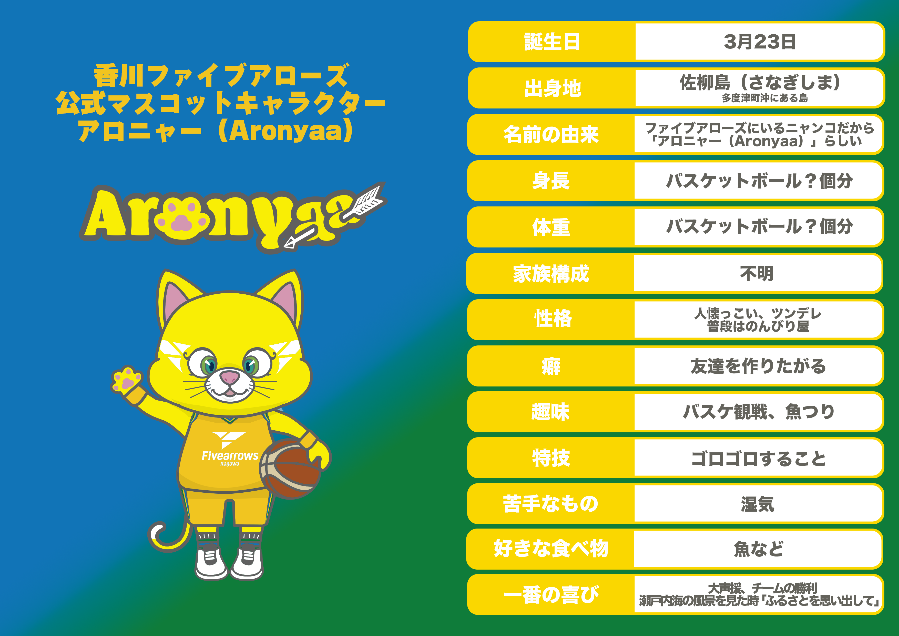 いつも香川ファイブアローズを応援していただき、誠にありがとうございます。 このたび、2026年2月14日(土) 東京八王子ビートレインズ戦にて、会場にアロニャーが登場することが決定しました! 海を渡って来ていたので、登場がこのタイミングとなりました。 本人も、クラブスタッフ一同も、楽しみにしておりますし、緊張もしております。 皆さま、温かく迎えていただきますようお願いいたします。 アロニャー プロフィール(Aronyaa)