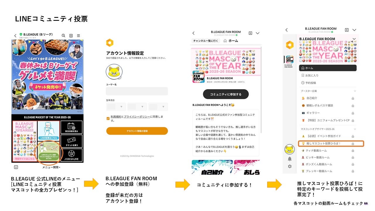 B.LEAGUE公式LINEコミュニティ「B.LEAGUE FAN ROOM」の推しマスコット投票ひろば!チャンネルで投票が可能です。