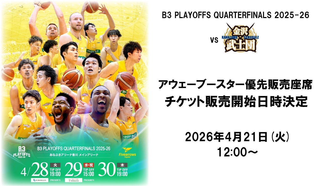 B3リーグ レギュラーシーズン 2025-26 第29節GAME1 2026年4月18日(土)の結果により、「B3 PLAYOFFS QUARTERFINALS 2025-26(準々決勝)」の対戦相手が 金沢武士団 に決定いたしました。 それに伴い、アウェーブースター優先販売座席の販売開始日時が決定いたしましたのでお知らせいたします。