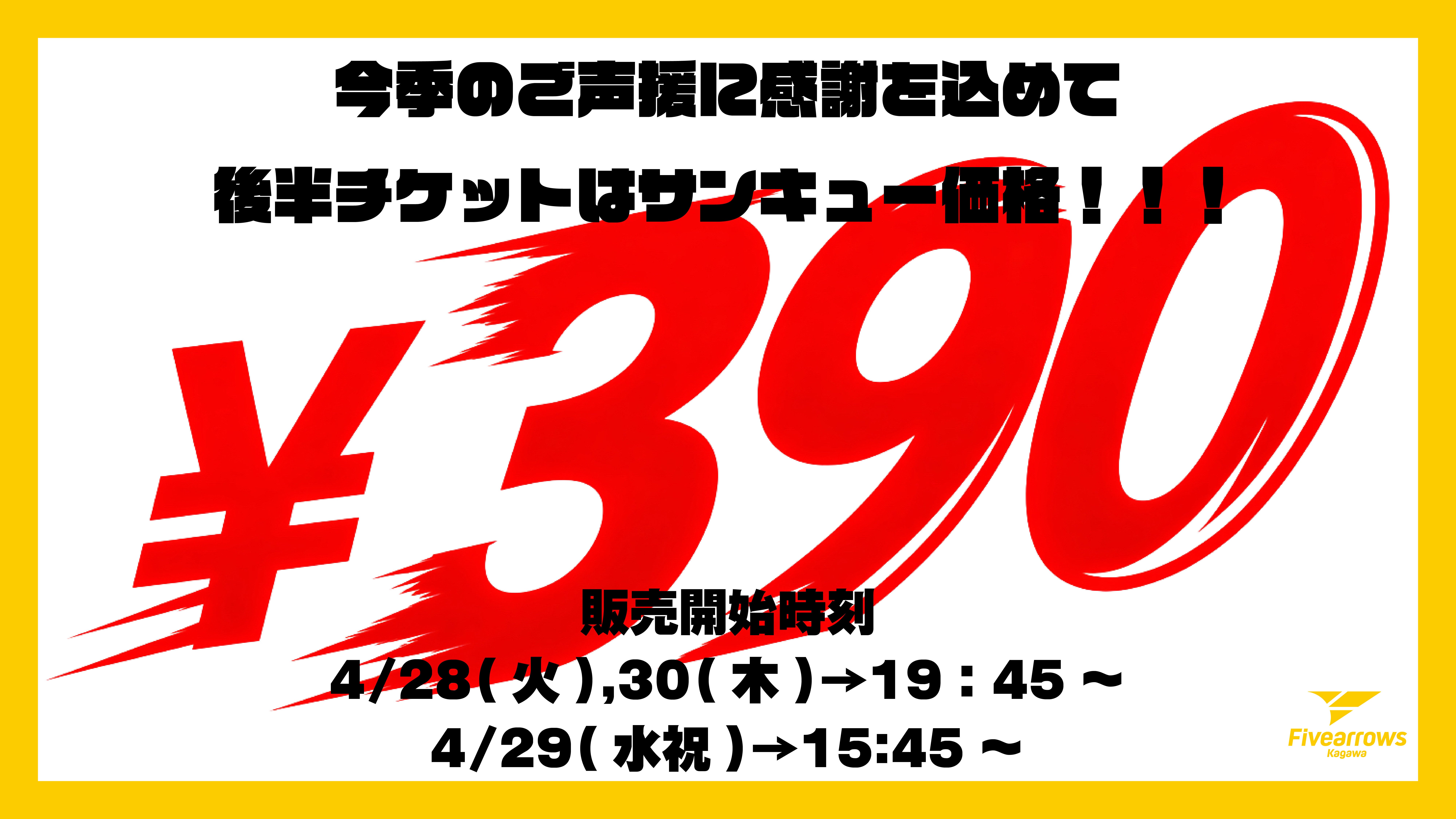 今シーズンのご声援に感謝を込めて後半チケット2F自由席を390円にて販売!!試合開始45分後から販売開始となります。